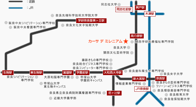 | 奈良リハビリテーション専門学校 | 高の原駅から電車で14分 東生駒駅から徒歩1分 |